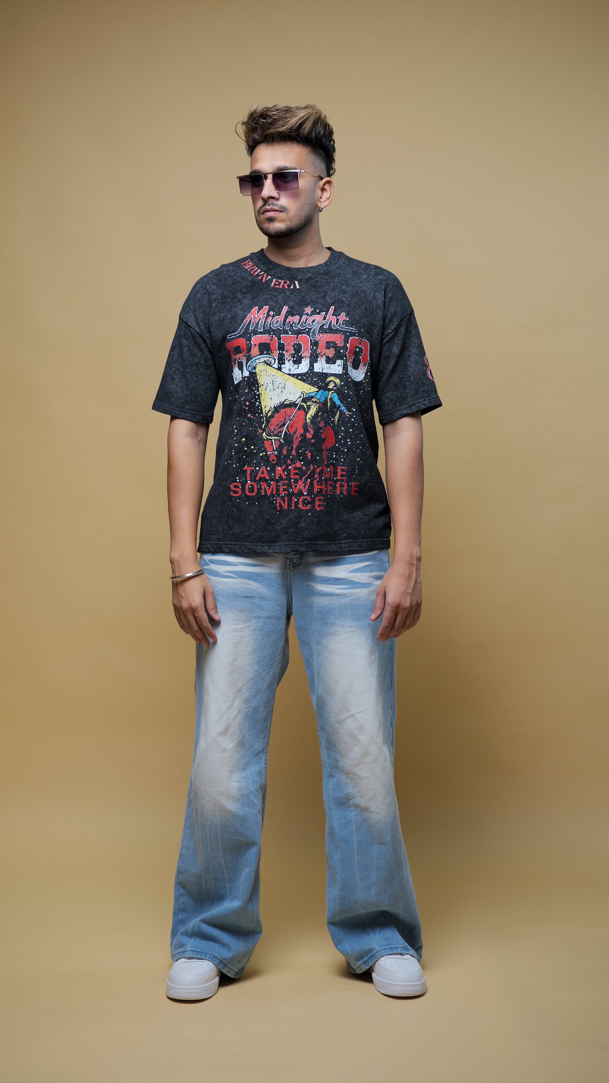 Experience the Black Acid Wash Midnight Rider T-Shirt crafted from premium fabric with superior print quality for lasting confidence. Its trendy oversized crop design and perfect length complement casual looks with jeans or cargo shorts, making it an ideal choice for embracing the latest streetwear trends effortlessly.